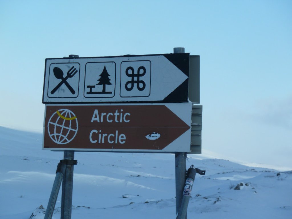В 14-00 по Московскому времени мы пересекли Полярный круг - 66 градусов 33 минуты северной широты. На спидометре 4 335 км. Подъезжая к Полярному кругу, мы обратили внимание, как сильно поменялся природный ландшафт. Пирамидальные сосны и ели превратились в заснеженную тундру. Не каждый день мы пересекаем Северный полярный круг! Вывалившись из машин, стали фотографироваться, стоя прямо на широте Полярного круга. Круто!
